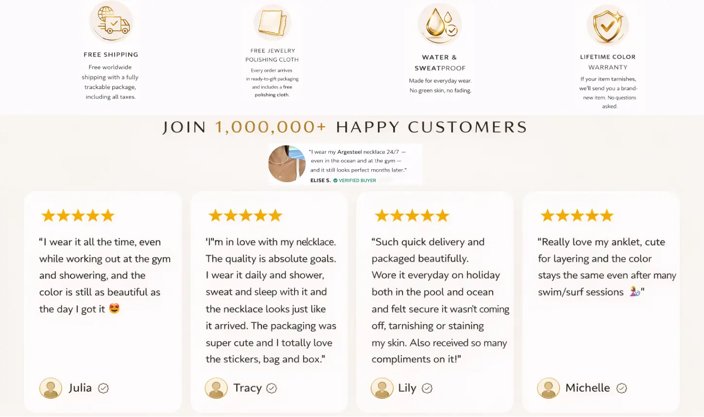 We feel confident that our jewelry won't lose color over time. In fact, we feel so confident about the quality that we'll provide you with aΒ lifetime warranty on allΒ gold or silver color issues.