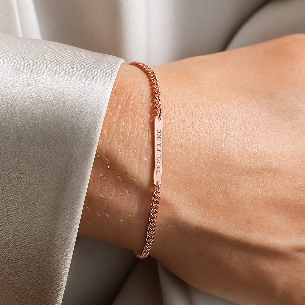 The Custom Name Bracelet combines modern simplicity with personalized elegance. Crafted in 925 sterling silver (S925), this light luxury bracelet allows you to engrave a name, initials, or special word, creating a piece that is uniquely yours. Its refined design makes it versatile enough for daily wear while still carrying the emotional value of a personalized keepsake. ✨